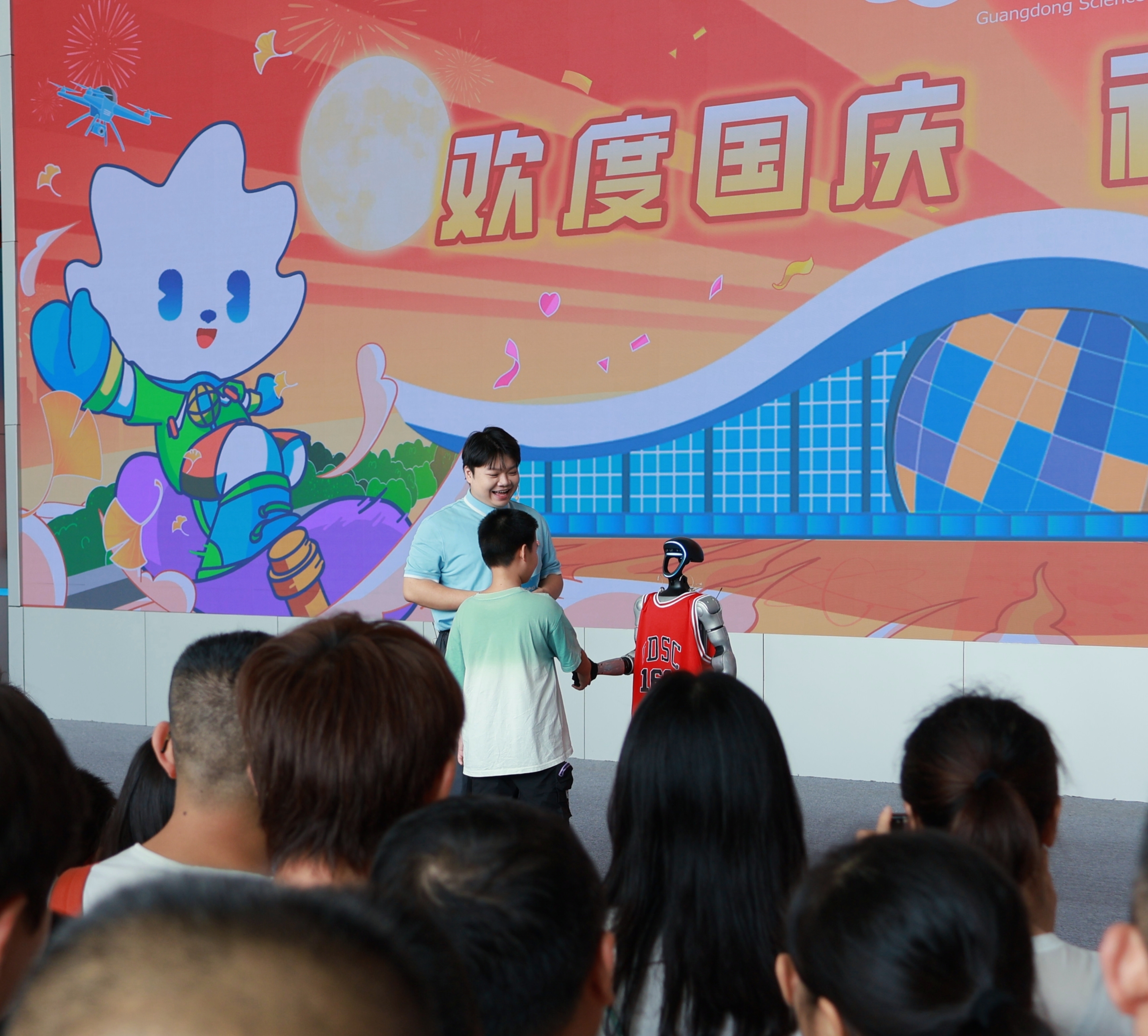 紧接着,我又登上科学表演台,成了演员。今天,我有一个特别的搭档——人形机器人。它能灵活地挥动机械臂,配合我表演。现场,台下一个小男孩踮着脚举手:“哥哥,机器人也能像我们一样听懂人话吗?”我邀请他向机器人提问。当机器人准确地回答:“今天是国庆节,祝大家国庆快乐!”,台下响起了掌声。节日里,科技的温度拉近了科学与游客的距离。