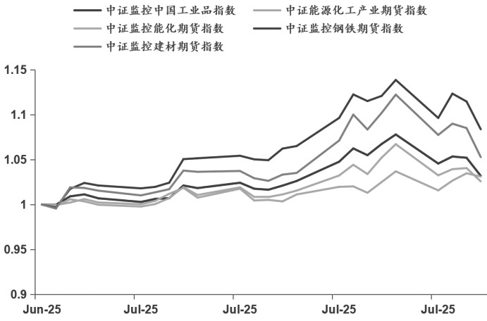 7月,中证商品期货指数(简称中证商品指数)上涨3.82%,中证商品期货价格指数(简称中证商品价格指数)上涨3.65%。当月商品市场整体受情绪驱动呈现冲高回落态势。第一阶段(7 月初至 7 月下旬):在光伏行业相关政策预期的催化下,市场对供给侧结构性改革的乐观情绪持续发酵,推动新能源、黑色及建材板块持续上涨。同时,传统消费旺季需求增加带动油价震荡上行,进而推升能化板块整体价格重心。此外,在美国生物柴油政策利好预期驱动下,油脂板块亦持续上涨。受此提振,中证商品指数呈现单边上行走势。第二阶段(7 月末):随着相关政策预期的阶段性消化,市场情绪逐步回归理性掌盘策略,前期涨幅较大的板块普遍转入震荡,商品指数也随之调整回落。