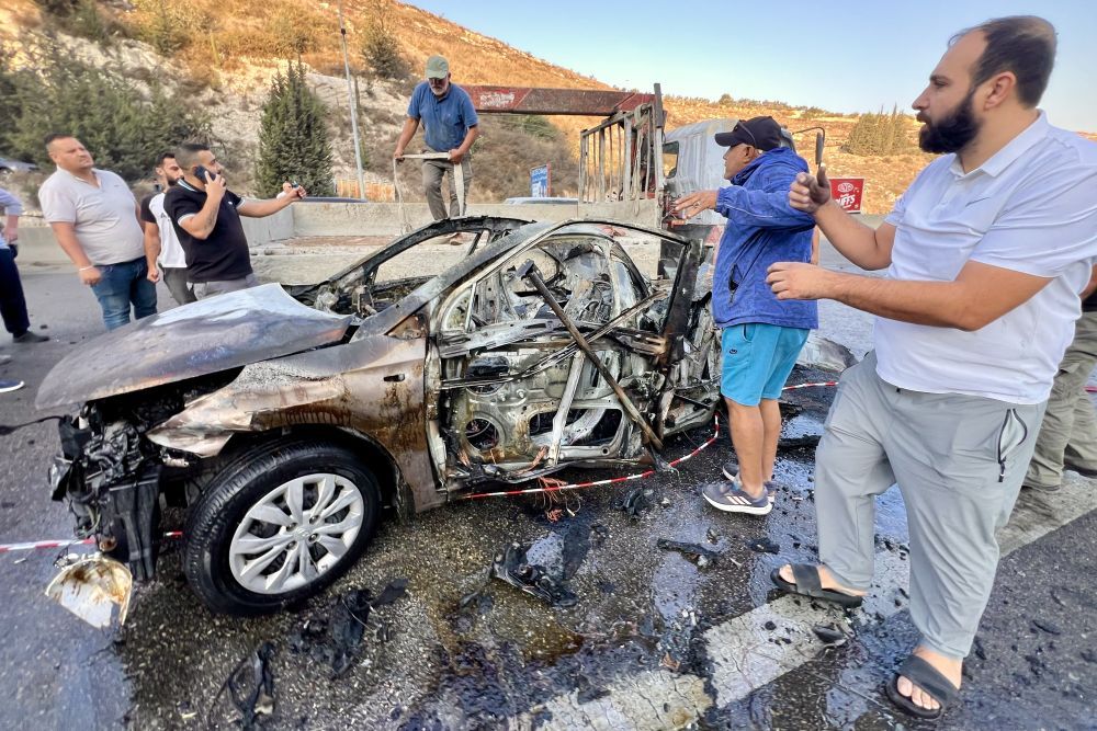 11月10日,在黎巴嫩南部西顿附近的比萨里耶镇,市民聚集在一辆被以色列无人机轰炸的汽车残骸前。新华社发(阿里·哈希绍摄)