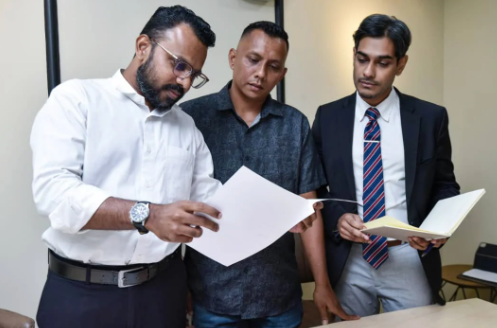 △莫哈末哈菲祖丁(中)在律师陪同下查阅相关文件。